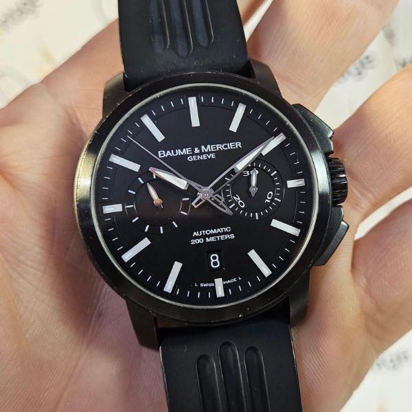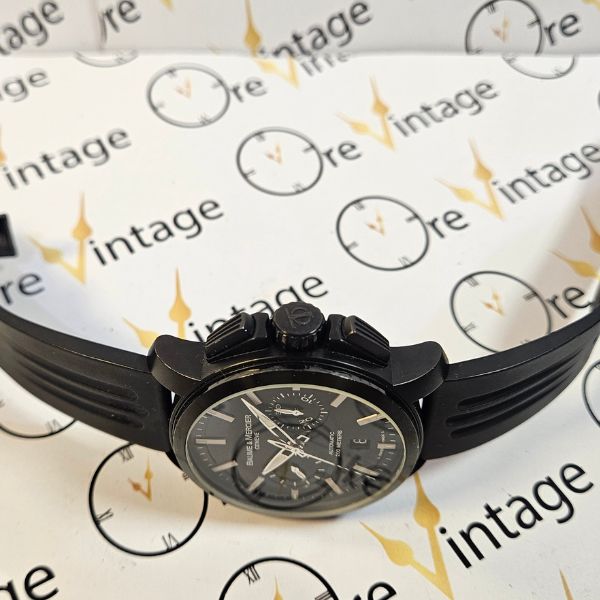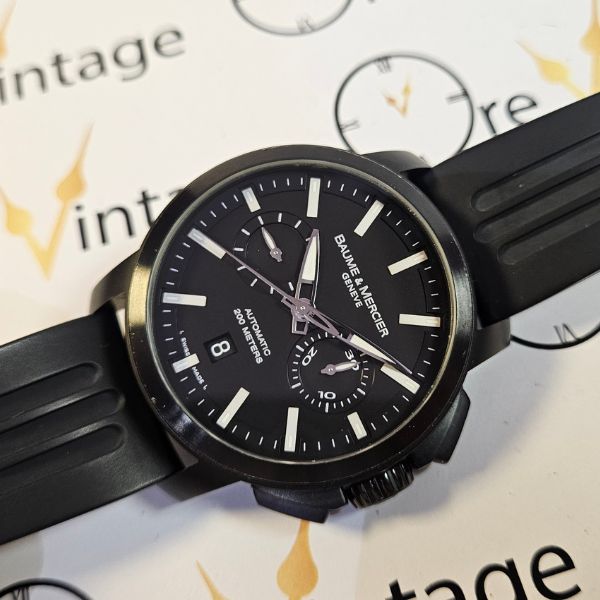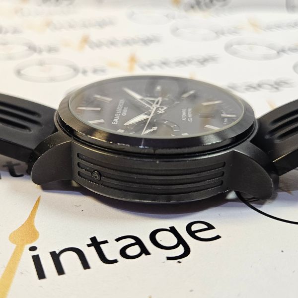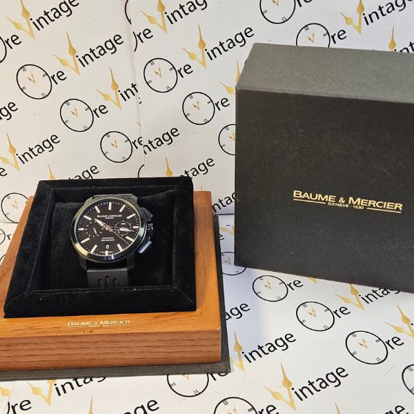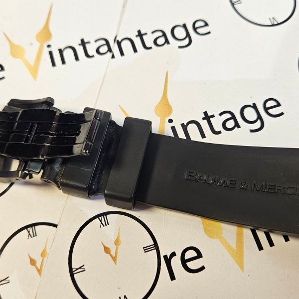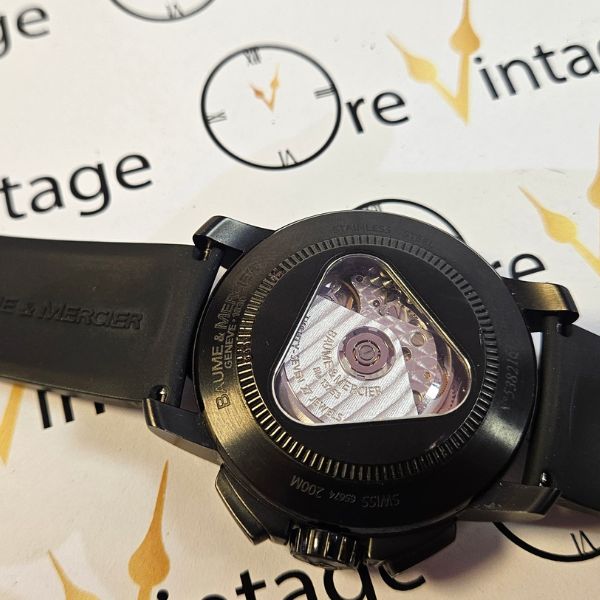 orologio di casa Baume Mercier con cassa in acciaio con trattamento PVD di diametro 44 mm , lug to lug di 52 mm , lo spessore è di 16 mm e la distanza tra le anse è di 23 mm . il vetro è minerale , la corona originale e il fondello sono a vite, il movimento che anima questo orologio è a carica automatica calibro BM13753 . cinturino in gomma originale . scatola