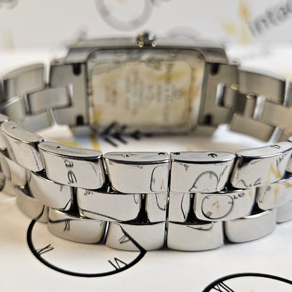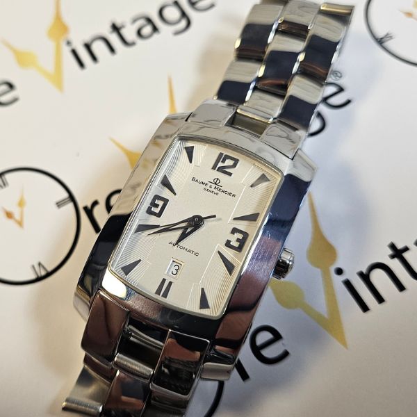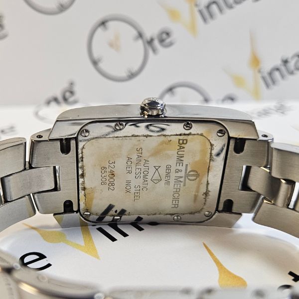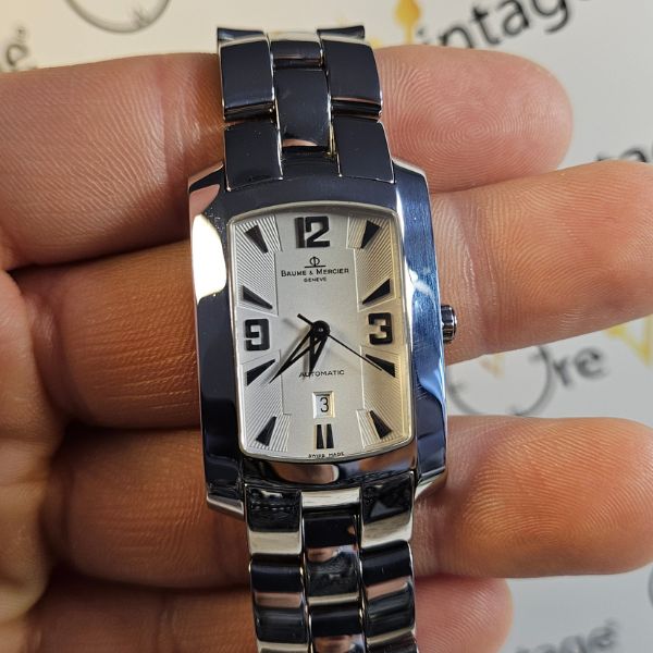 elegante orologio di casa Baume Mercier con cassa in acciaio di misure 30 x 40 mm , spessore 8.5 mm . il vetro curvo è zaffiro , la corona originale è a pressione e il fondello è serrato con 8 viti . il movimento che anima questo orologio è a carica automatica ETA 2000 . bracciale originale