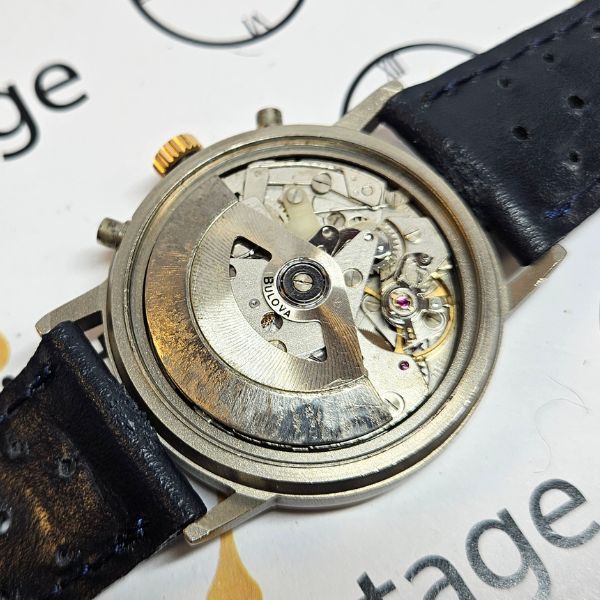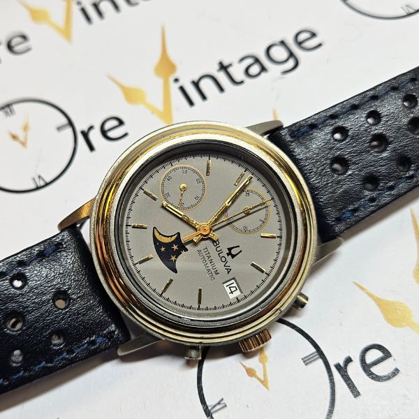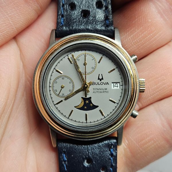 splendido orologio di casa Bulova con cassa in titanio di diametro da 38.5 mm , lug to lug di 45 mm , lo spessore è di 13 mm e la distanza tra le anse è di 22 mm . il vetro è minerale , la corona è a pressione e il fondello è a scatto , il movimento che anima questo orologio è a carica automatica cal. Valjoux 7751 con funzione di cronografo , data e fasi lunari