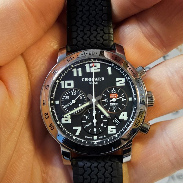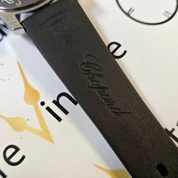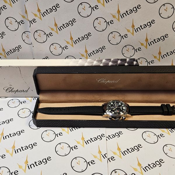 strepitoso orologio di casa Chopard con cassa acciaio di misure 40 mm , lug to lug 48 mm , spessore di 12,5 mm e ansa da 19 mm . il vetro è zaffiro , la corona è a pressione , il fondello è serrato con 8 viti . il movimento è a carica automatica su base ETA 2894-2 . orologio assegnato al pilota che me lo ha venduto !!!!! SCATOLA