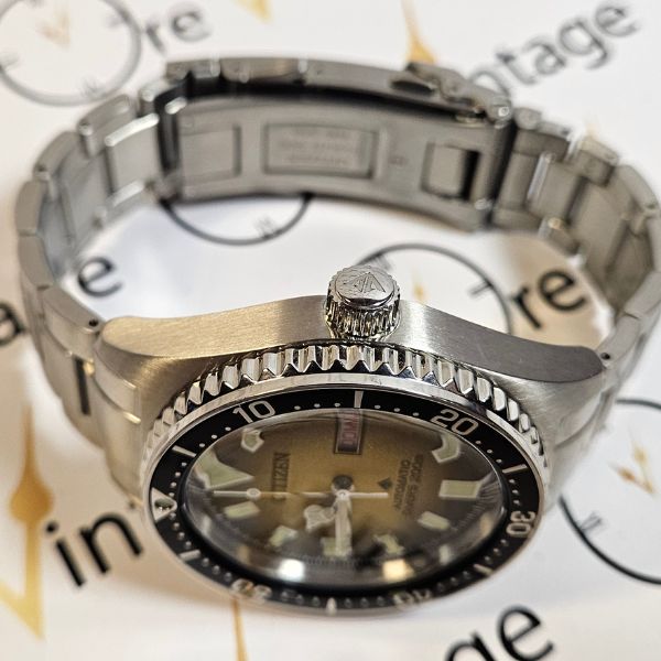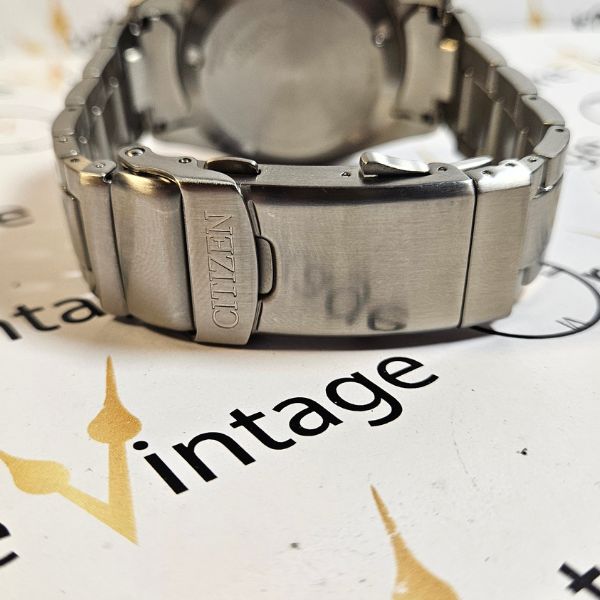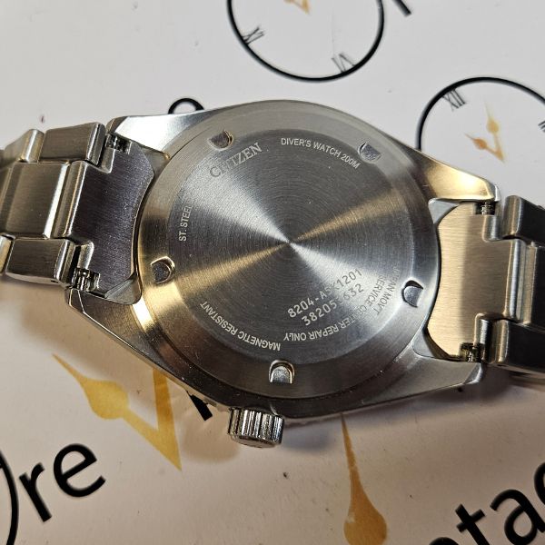 sportivo orologio di casa Citizen con cassa in acciaio di diametro 41 mm , lug to lug di 51 mm , lo spessore è di 14 mm e la distanza tra le anse è di 20 mm . il vetro è minerale , la corona e il fondello in acciaio sono a vite . il movimento che anima questo orologio è a carica automatica , calibro citizen 8204 . è presente la scatola .