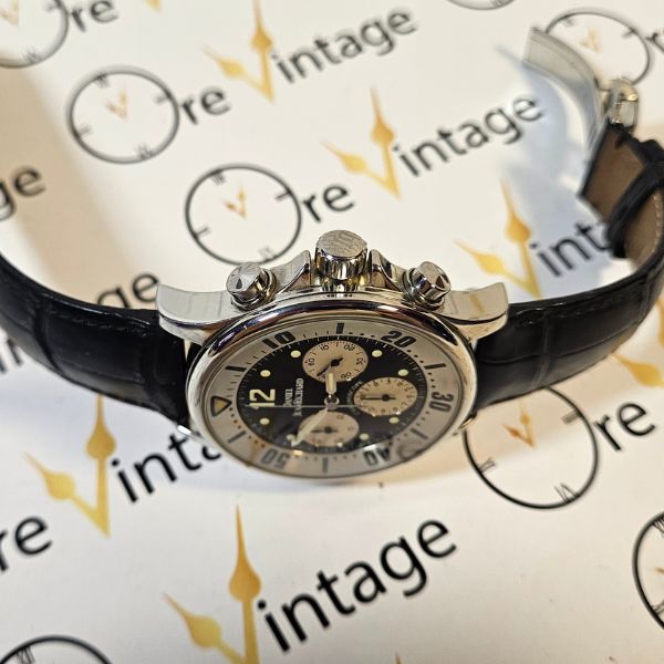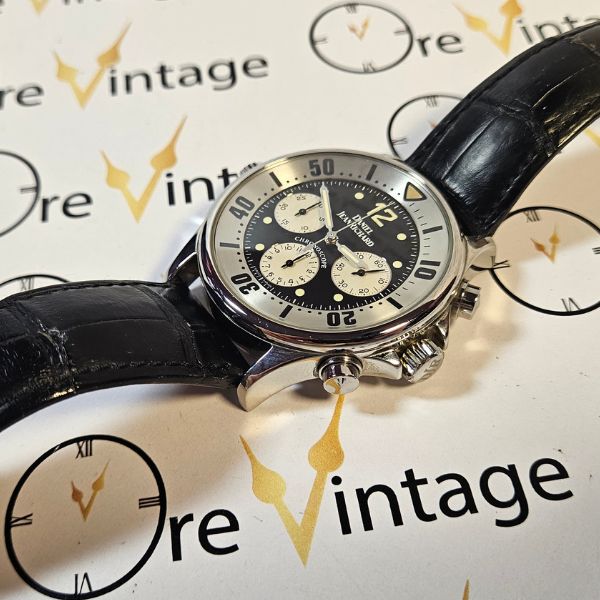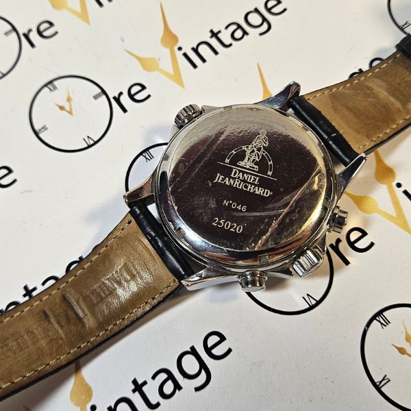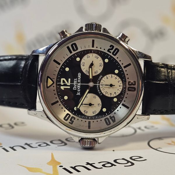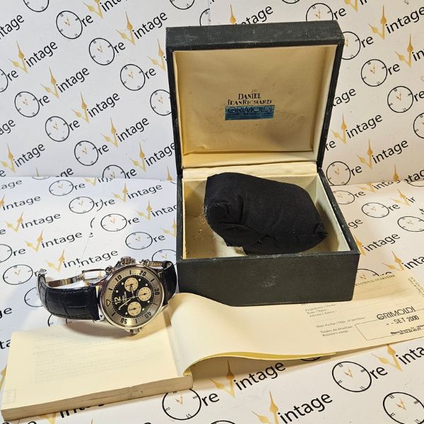 fantastico cronografo di casa Daniel Jean Richard con cassa in acciaio di misure 43 mm , lug to lug 51 mm , spessore di 14 mm e la distanza tra le anse è di 22 mm . il vetro è zaffiro , la corona a ore 3 è a pressione mentre la corona a ore 9 è a vite. il fondello è a vite . la ghiera interna è girevole bidirezionale il movimento è a carica automatica cal ETA 2824-2 con funzione di cronografo . cinturino originale , scatola e garanzia timbrata settembre 2000