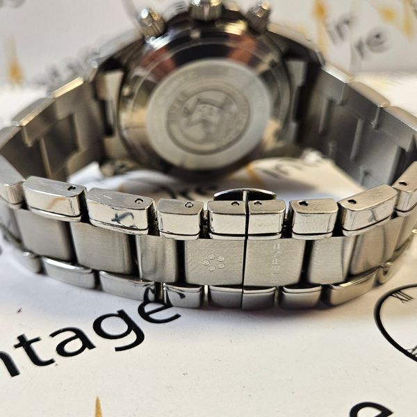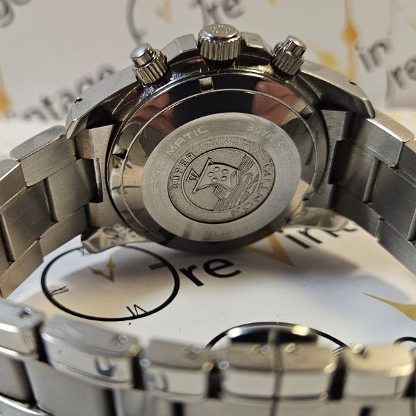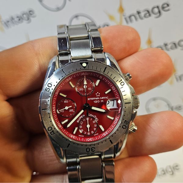 sportivo orologio di casa Eterna Matic con cassa in acciaio di diametro 39 mm , lug to lug di 47 mm , lo spessore è di 15 mm e la distanza tra le anse è di 20 mm . il vetro è zaffiro , la corona e il fondello sono a vite , la ghiera è girevole unidirezionale  . il movimento che anima questo orologio è a carica automatica calibro 7750 di casa Valjoux . bracciale originale