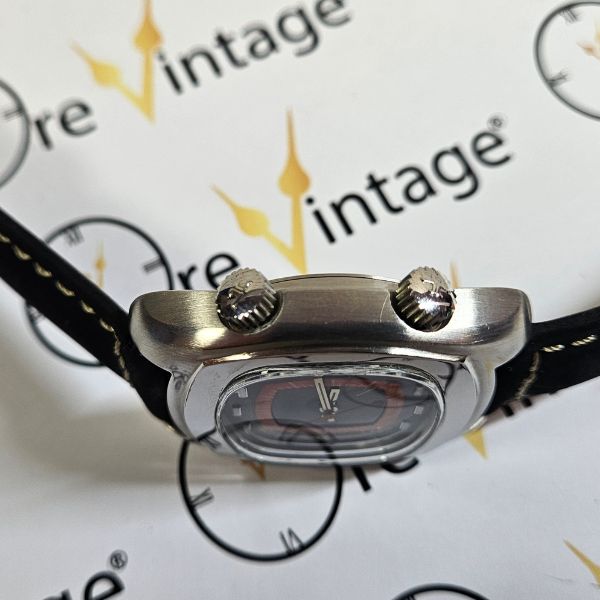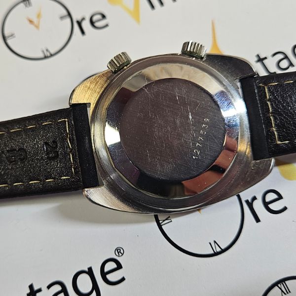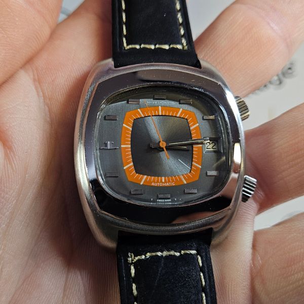 RARO orologio di casa Jaeger LeCoultre con la cassa in acciaio di diametro 38,5 mm escluso corona , lug t lug di 45 mm lo spessore è di 12 mm e la distanza tra le anse è di 20 mm. il vetro è plexiglass , le corone originali sono a pressione , il fondello è a vite . il movimento che anima questo orologio è a carica automatica calibro Jaeger 916 con funzione Svegliarino .