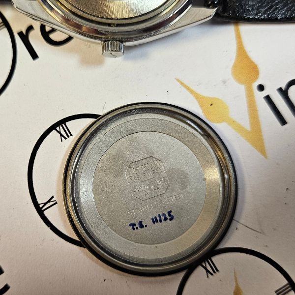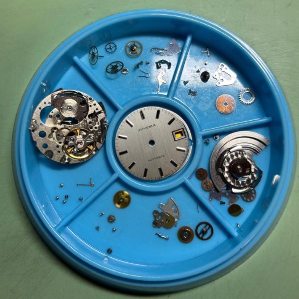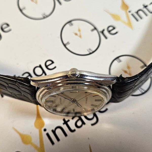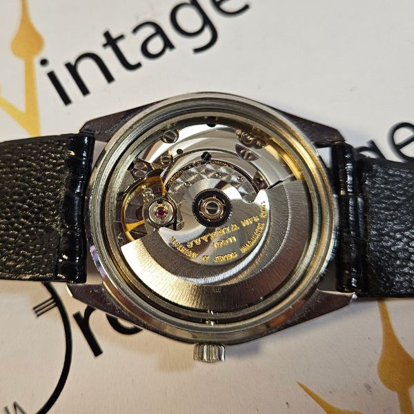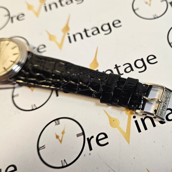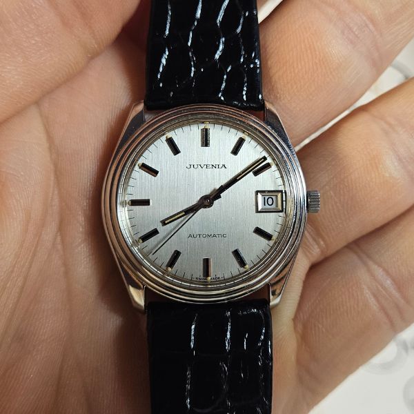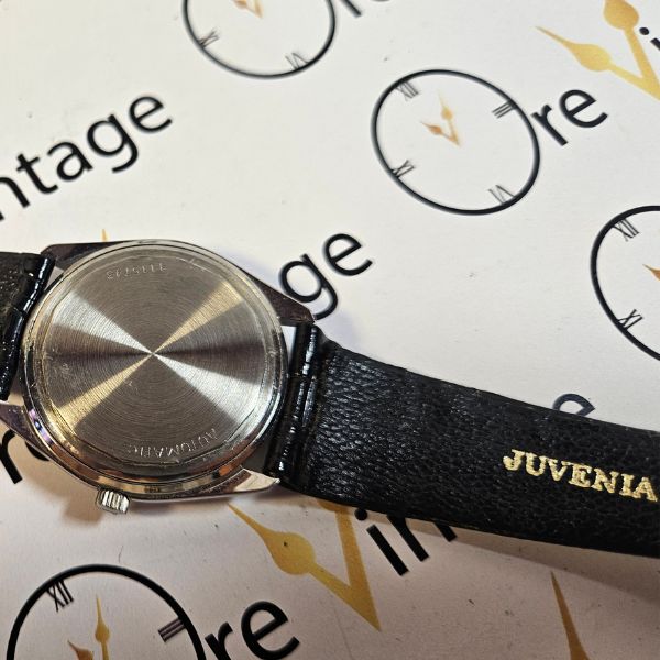 orologio di casa Juvenia con cassa in acciaio di diametro 34 mm , lug to lug di 36 mm , lo spessore è di 9 mm e la distanza tra le anse è di 20 mm . il vetro è plexiglass , la corona originale è a pressione e il fondello è a vite . il movimento che anima questo orologio è a carica automatica ,calibro Juvenia 10811 . cinturino originale