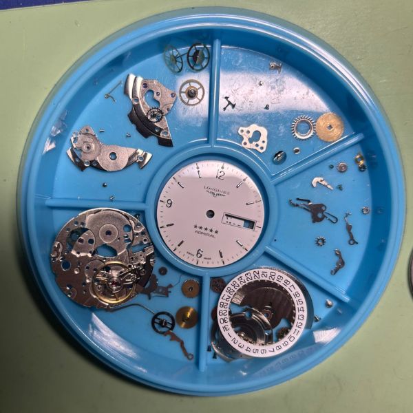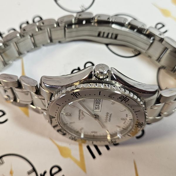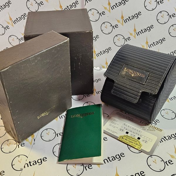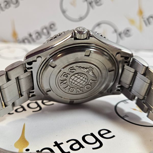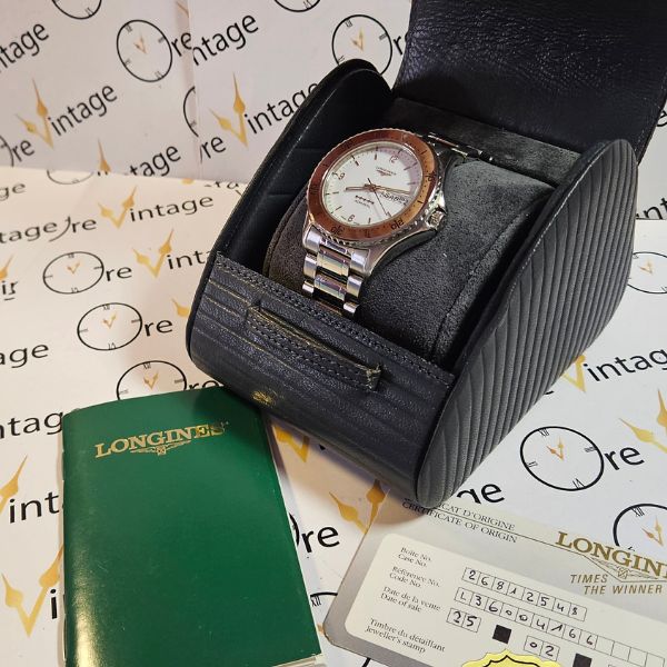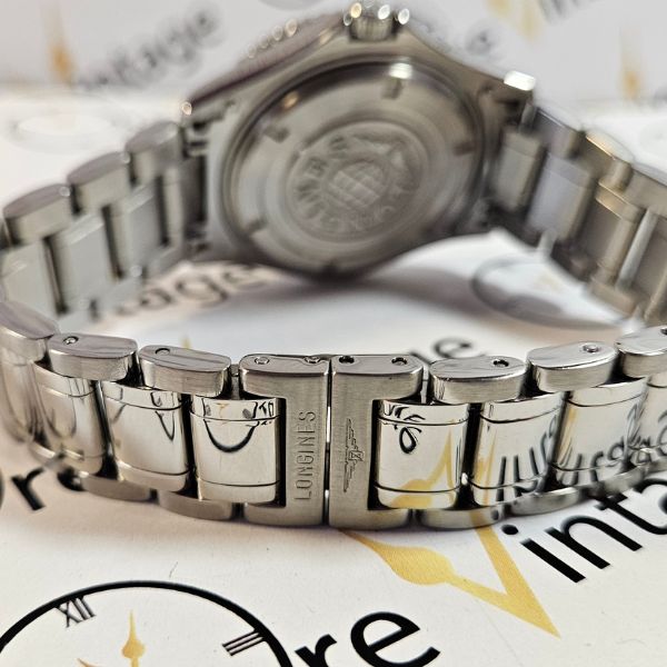 orologio di casa Longines con cassa in acciaio di diametro 38 mm , lug to lug di 44 mm , lo spessore è di 11 mm e la distanza tra le anse è di 20 mm .il vetro è minerale , la corona originale e il fondello sono a vite , la ghiera è girevole unidirezionale . il movimento che anima questo orologio è a carica automatica calibro Longines L636 . orologio con corredo