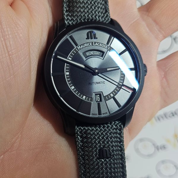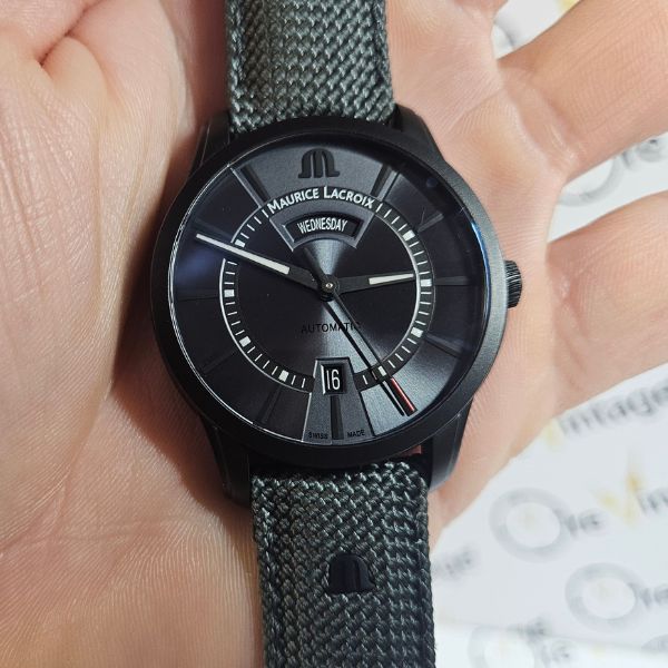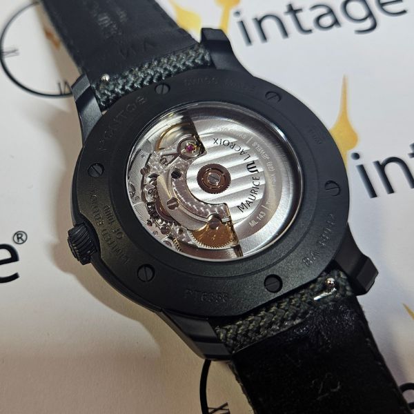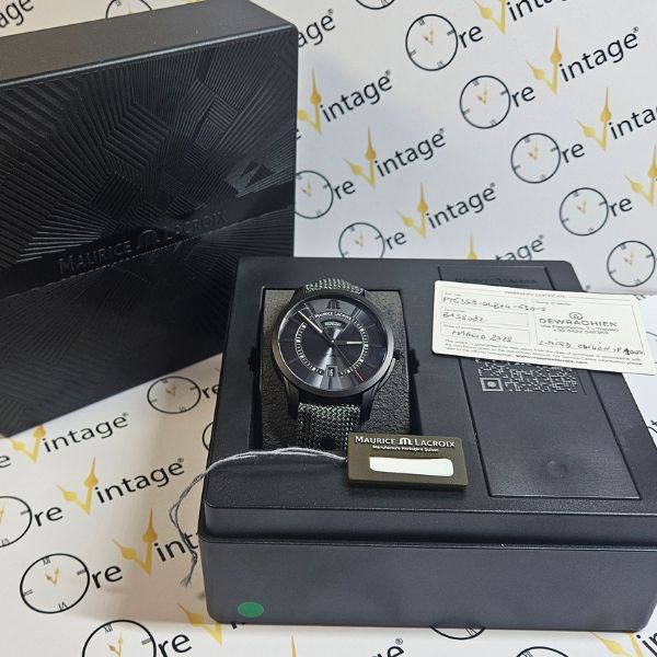 bellissimo e raro orologio di casa Maurice Lacroix con la cassa in acciaio con trattamento DLC di diametro 41 mm escluso corona , lug to lug di 48 mm lo spessore è di 11 mm e la distanza tra le anse è di 20 mm . il vetro è zaffiro , la corona è a vite e il fondello è serrato con 6 viti . il movimento che anima questo orologio è a carica automatica , calibro ML143 . OROLOGIO IN EDIZIONE LIMITATA DI 1000 PEZZI , SCATOLA E GARANZIA TIMBRATA MAGGIO 2025
