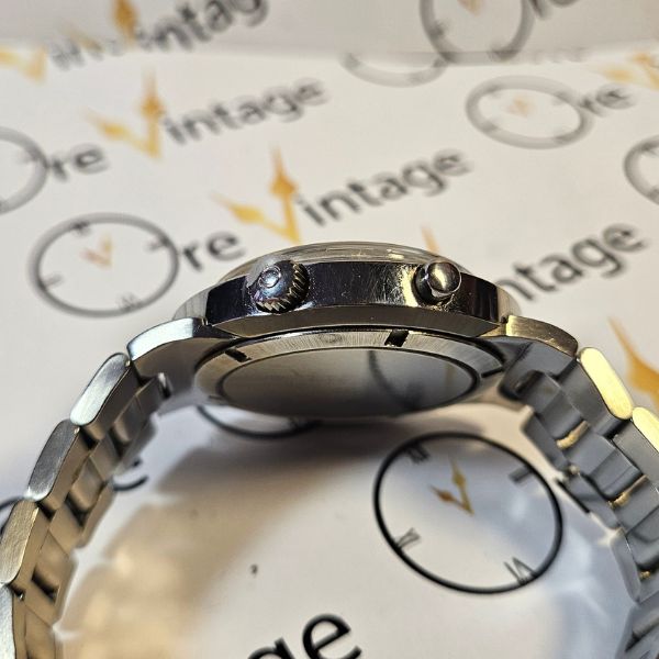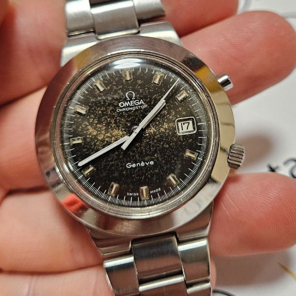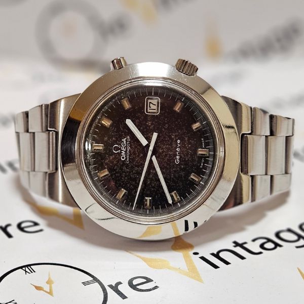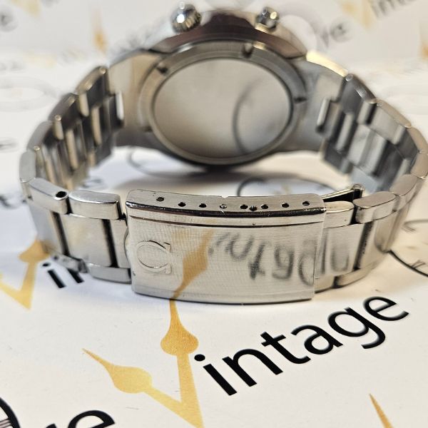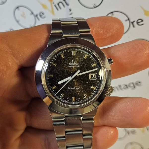 bellissimo chronostop di casa Omega con cassa monoblocco in acciaio di misure 41 mm , lug to lug 48 mm , spessore di 12.5 mm . il vetro ORIGINALE è plexiglass , la corona originale è a pressione . il movimento è a carica manuale calibro omega 920 con funzione di chronostop . il bracciale è originale Omega