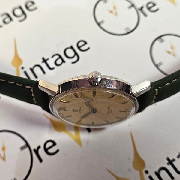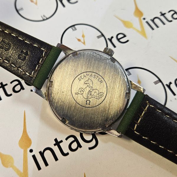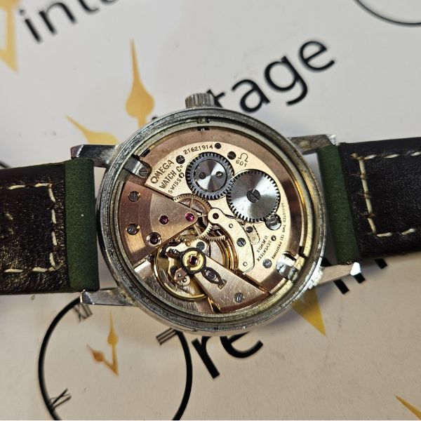 orologio di casa Omega con cassa in acciaio di diametro 34 mm , lug to lug di 40 mm , lo spessore è di 8.5 mm e la distanza tra le anse è di 18 mm . il vetro è plexiglass , la corona originale è a pressione e il fondello è a vite, il movimento che anima questo orologio è a carica manuale calibro Omega 601 .