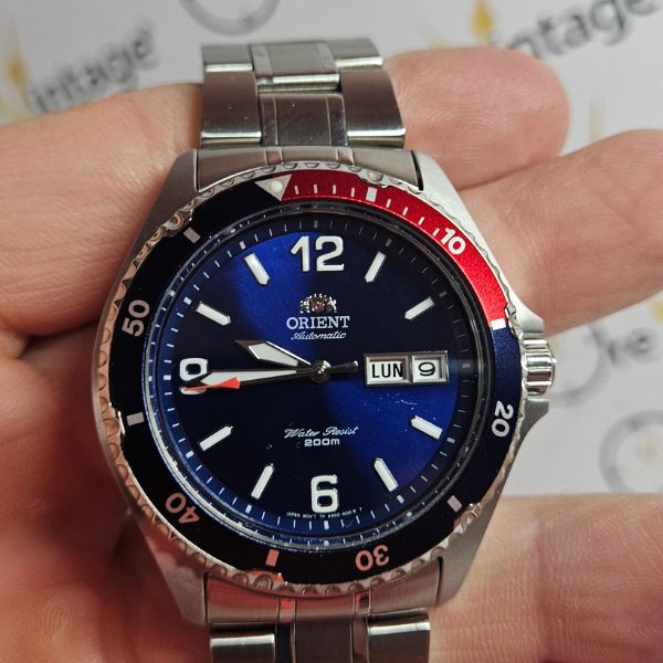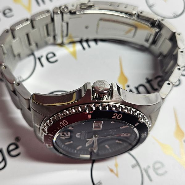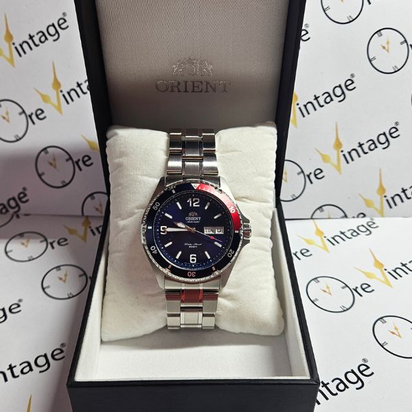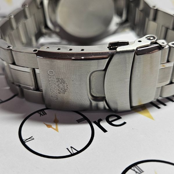 orologio di casa Orient con la cassa in acciaio da 41 mm escluso corona , lug to lug di 47 mm , lo spessore è di 13 mm e la distanza tra le anse é di 22 mm . il vetro é minerale , la corona e il fondello sono a vite , la ghiera é girevole unidirezionale . il movimento che anima questo orologio é a carica automatica , calibro F6922 . bracciale originale , compreso di scatola