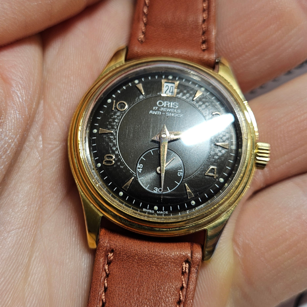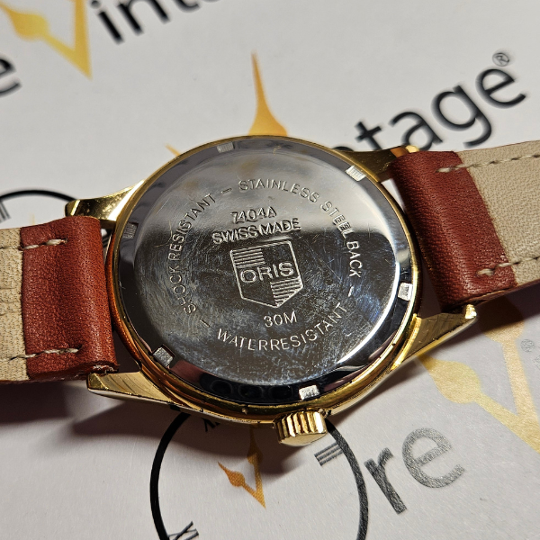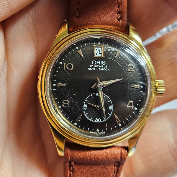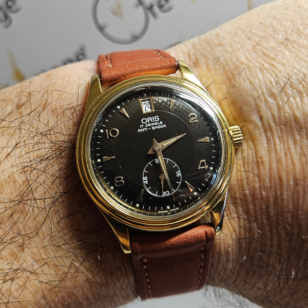 orologio di casa Oris con la cassa placcata da 34 mm escluso corona , lug to lug di 40 mm , lo spessore è di 9.5 mm e la distanza tra le anse é di 18 mm . il vetro é plexiglass , la corona é a pressione e il fondello in acciaio é a vite . il movimento che anima questo orologio é a carica manuale calibro FE233-69-E-21