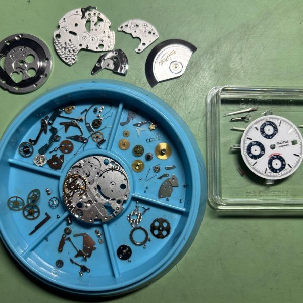 cronografo di casa Paul Picot con la cassa in acciaio da 38 mm escluso corona , lug to lug di 46 mm , lo spessore è di 14 mm e la distanza tra le anse é di 19 mm . il vetro é zaffiro , la corona e il fondello sono a vite . il movimento che anima questo orologio é a carica automatica calibro Valjoux7750 . bracciale originale , compreso di scatola e garanzia