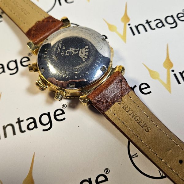 cronografo di casa Pryngeps con cassa placcata 10 micron di diametro 37mm , lug to lug di 45 mm , lo spessore è di 14 mm e la misura tra le anse è di 19mm . il vetro è minerale , la corona è a pressione e il fondello in acciaio è a vite , la ghiera è fissa . il movimento che anima questo orologio è a carica automatica Valjoux 7750 . cinturino originale