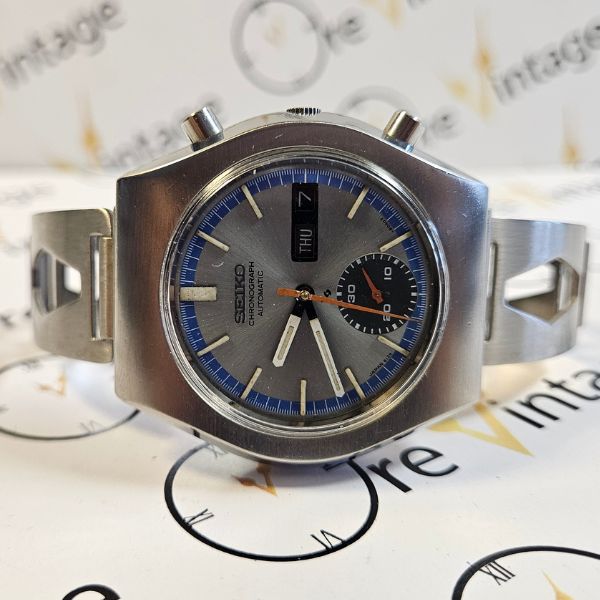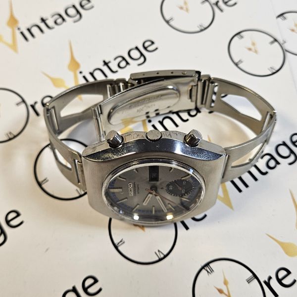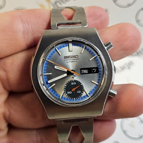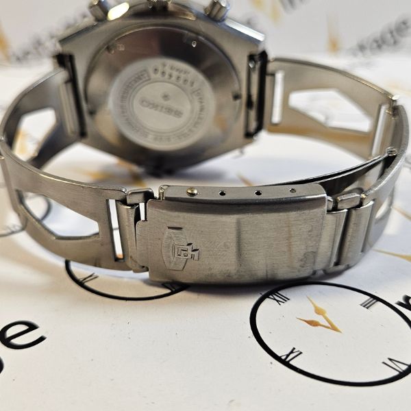 cronografo di casa Seiko con cassa in acciaio di diametro 40 mm , lug to lug di 42 mm , lo spessore è di 14 mm e la distanza tra le anse è di 20 mm . il vetro è plexiglass , la corona è a pressione e il fondello è a vite . il movimento che anima questo orologio è a carica automatica cal. 6139