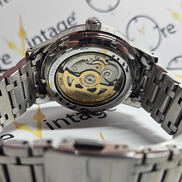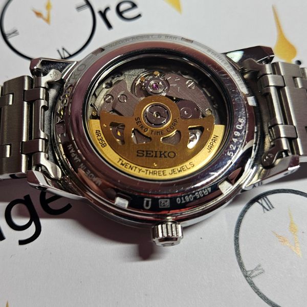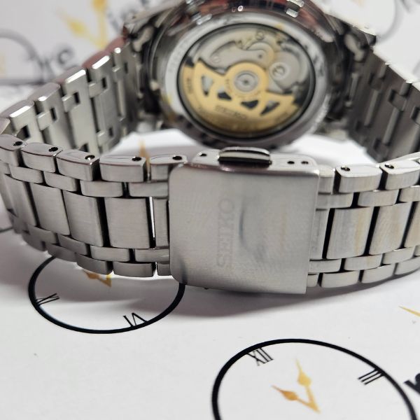 bellissimo orologio di casa Seiko con la cassa in acciaio da 39.5 mm escluso corona , lug to lug di 46 mm , lo spessore è di 12 mm e la distanza tra le anse é di 20 mm . il vetro é hardlex , la corona é a pressione e il fondello é a vite . il movimento che anima questo orologio é a carica automatica , calibro seiko 4R35 . bracciale originale compreso di scatola e garanzia timbrata 7-2025 .