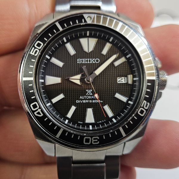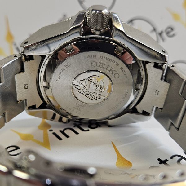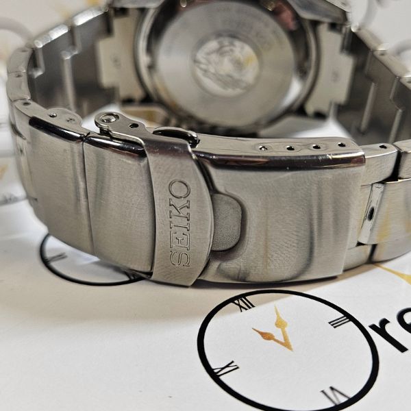 orologio di casa Seiko con la cassa in acciaio di diametro 44 mm escluso corona , lug t lug di 48 mm lo spessore è di 13 mm e la distanza tra le anse è di 22 mm. il vetro è hardlex , la corona e il fondello sono a vite , la ghiera é girevole unidirezionale . il movimento che anima questo orologio è a carica automatica calibro seiko 4R35 .