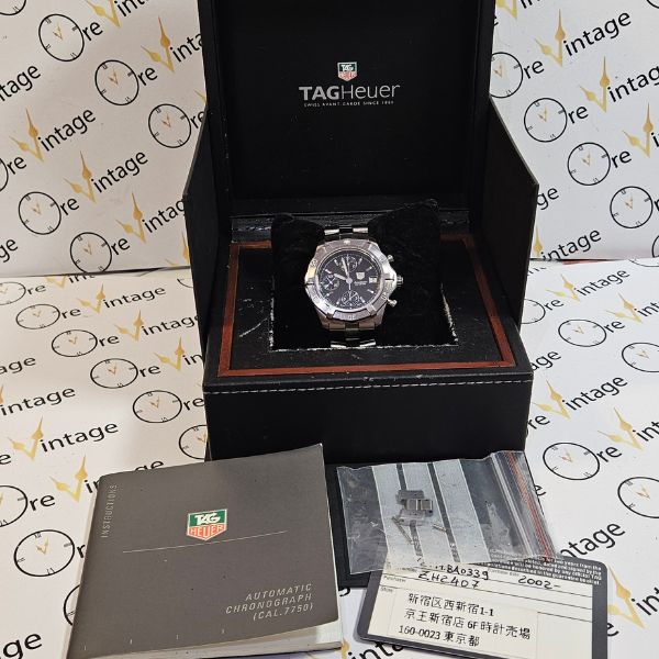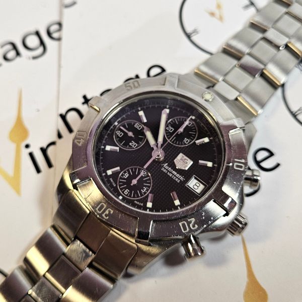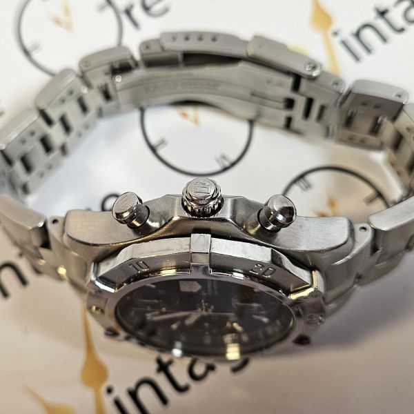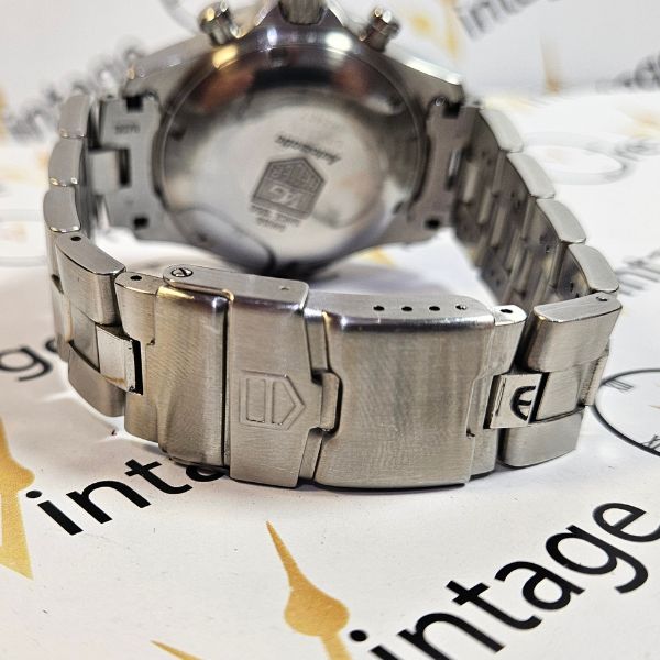 sportivo orologio di casa Tag Heuer con cassa in acciaio di diametro 40 mm , lug to lug di 45 mm , lo spessore è di 15 mm e la distanza tra le anse è di 20 mm . il vetro è zaffiro , la corona e il fondello in acciaio sono a vite , la ghiera è girevole unidirezionale . il movimento che anima questo orologio è a carica automatica , calibro valjoux 7750 . bracciale originale . scatola e garanzia timbrata nel 2002 .