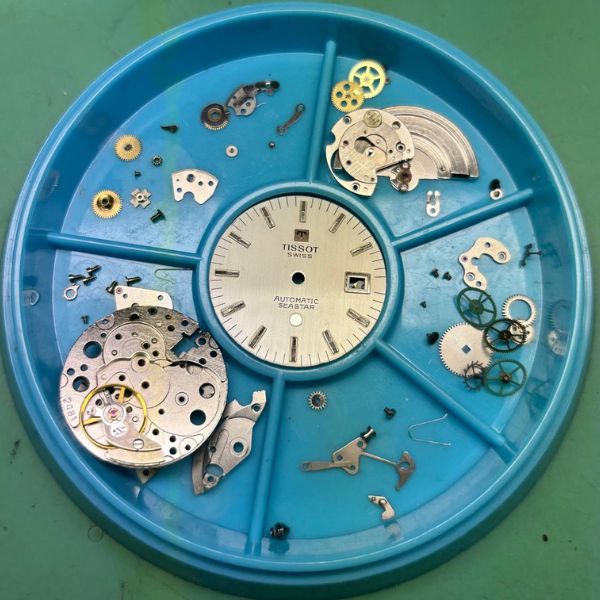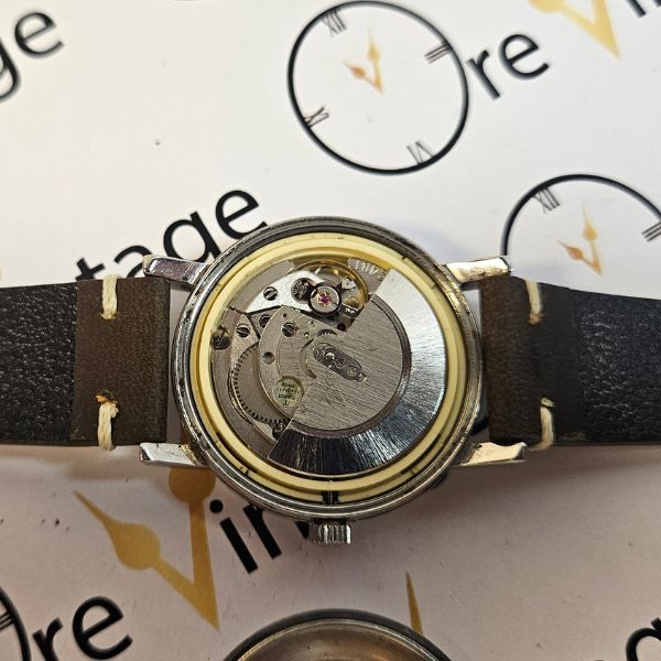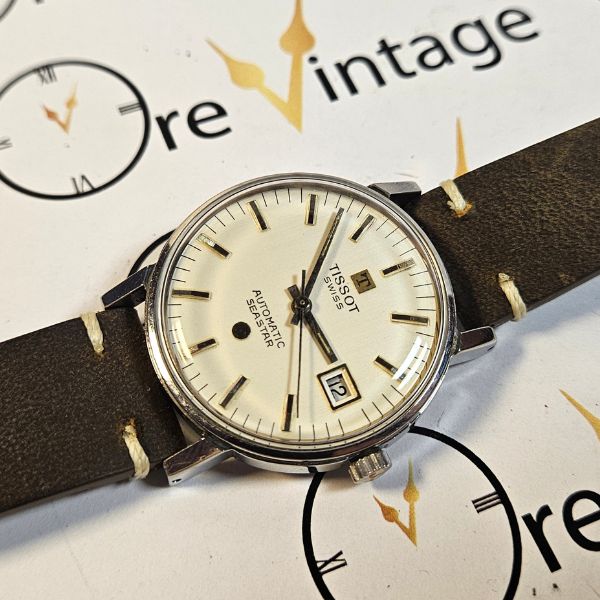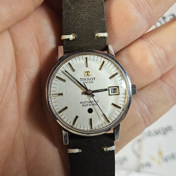 orologio di casa Tissot con cassa in acciaio di diametro 34 mm , lug to lug di 40 mm , lo spessore è di 12 mm e la distanza tra le anse è di 18 mm . il vetro è plexiglass , la corona originale è a pressione e il fondello è a vite . il movimento che anima questo orologio è a carica automatica ,calibro tissot 2481 .