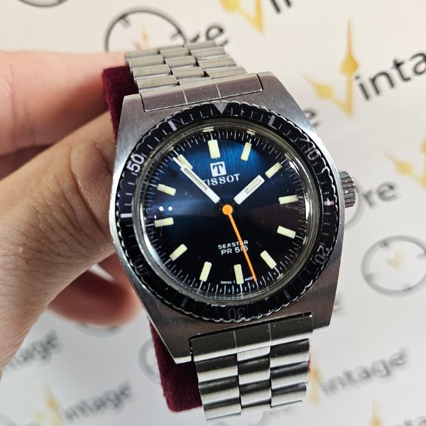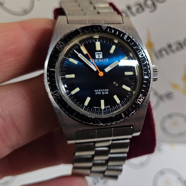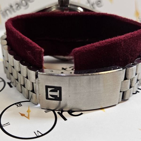 orologio di casa Tissot con la cassa in acciaio di diametro 36 mm escluso corona , lug t lug di 43 mm lo spessore è di 10,5 mm e la distanza tra le anse è di 19 mm. il vetro è plexiglass , la corona originale è a pressione e il  fondello è serrato a vite , la ghiera è girevole bidirezionale. il movimento che anima questo orologio è a carica manuale cal. tissot 781-1 . bracciale originale