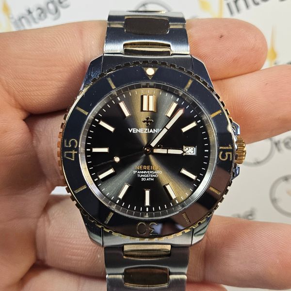 bellissimo orologio di casa Venezianico con la cassa in acciaio di diametro 42 mm escluso corona , lug t lug di 49 mm lo spessore è di 12 mm e la distanza tra le anse è di 22 mm. il vetro è zaffiro , la corona a vite e il fondello è serrato con 6 viti , la ghiera è girevole unidirezionale in tungsteno . il movimento che anima questo orologio è a carica automatica cal. Sellita SW200 . orologio completo di scatola e garanzia timbrata nel Marzo 2023 .