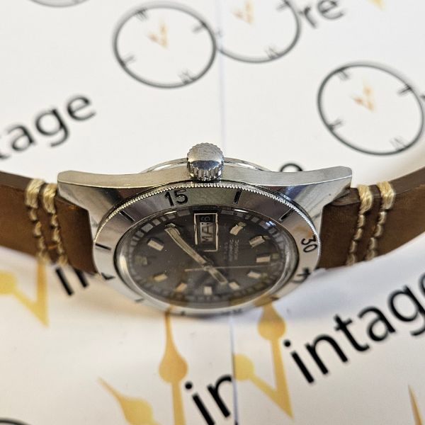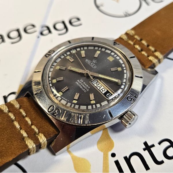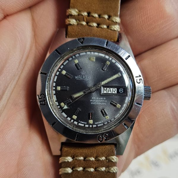 orologio di casa Walker con cassa in acciaio di diametro 36 mm , lug to lug di 45 mm , lo spessore è di 11.5 mm e la distanza delle anse è di 19 mm , la ghiera è girevole bidirezionale .il vetro è plexiglass , la corona è a pressione e il fondello è a vite . il movimento che anima questo orologio è a carica automatica cal. A.S. 1916 .