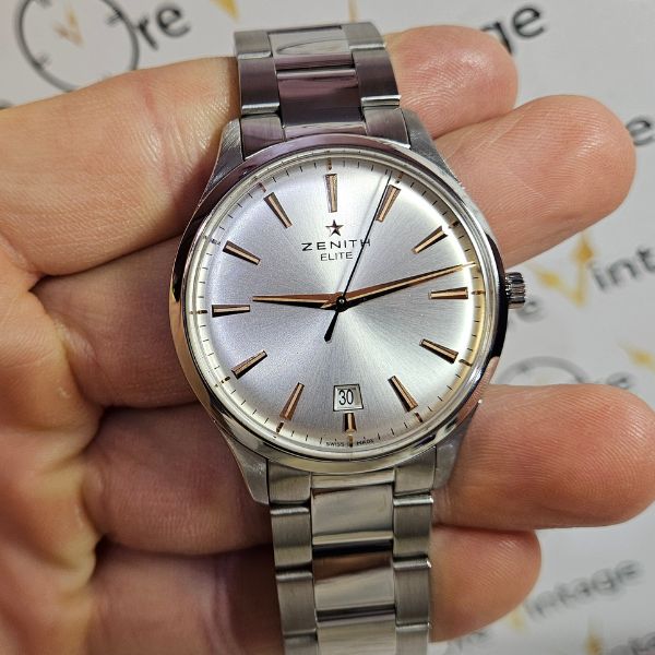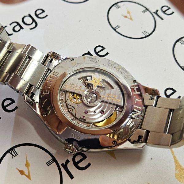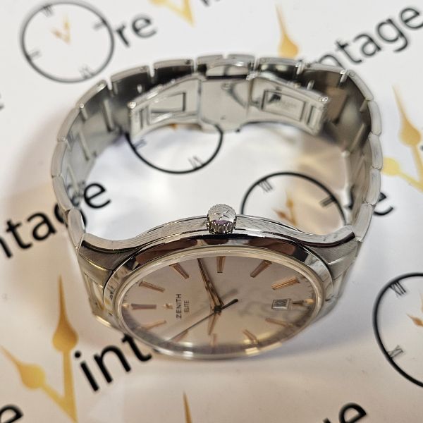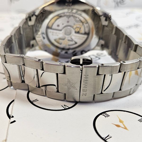 strepitoso orologio di casa Zenith con cassa in acciaio di diametro 40 mm , lug to lug di 47 mm , lo spessore è di 8 mm e la distanza tra le anse è di 20 mm . il vetro è zaffiro , la corona è a pressione e il fondello con oblò centrale è serrato con 4 viti . il movimento che anima questo orologio è a carica automatica , calibro SOTTILISSIMO di casa Zenith cal. 670 . bracciale originale