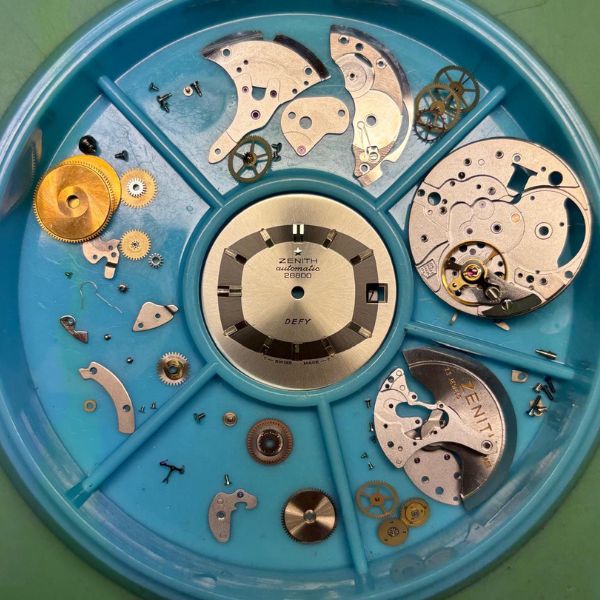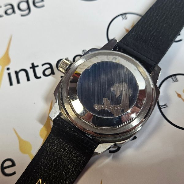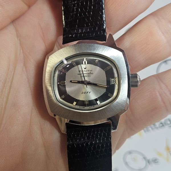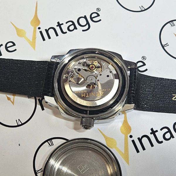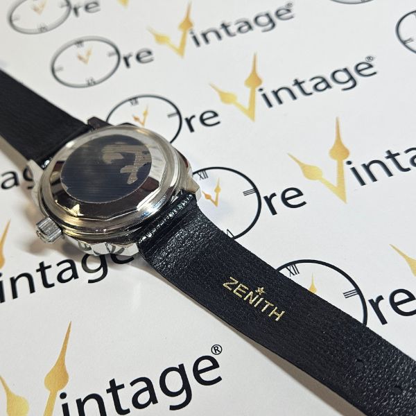 affascinante orologio di casa Zenith con la cassa in acciaio di diametro 36 mm escluso corona , lug to lug di 42 mm lo spessore è di 12 mm e la distanza tra le anse è di 18 mm . il vetro è plexiglass , la corona originale e il fondello sono a vite . il movimento che anima questo orologio è a carica automatica , calibro zenith 2562PC . condizioni spettacolari , cinturino originale fibbia generica