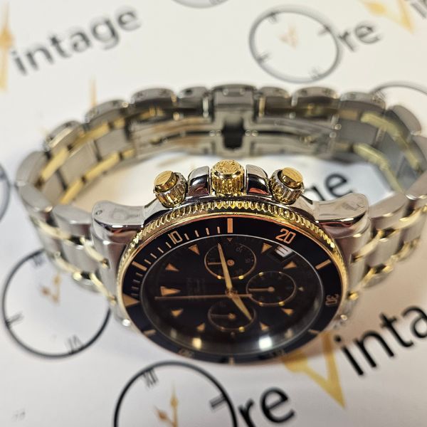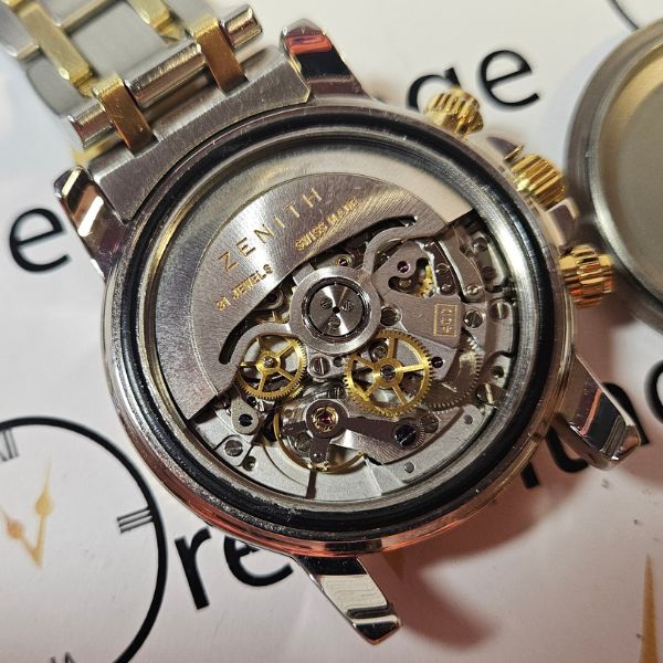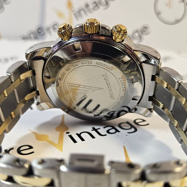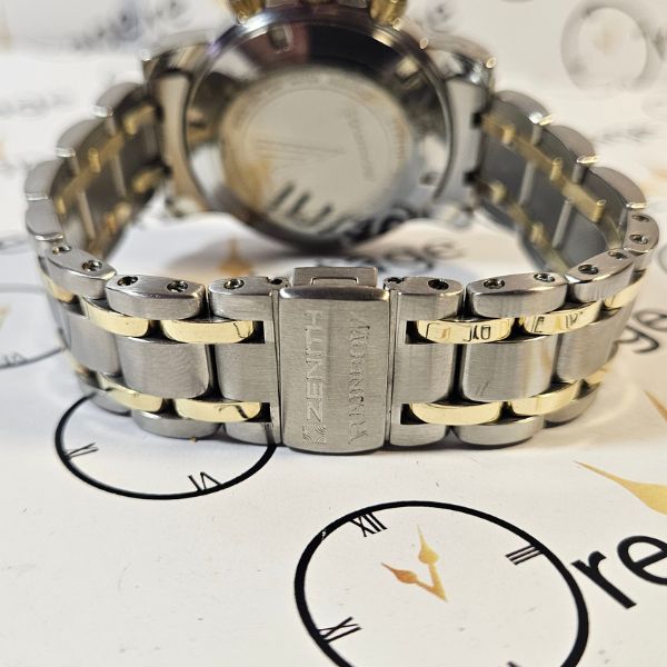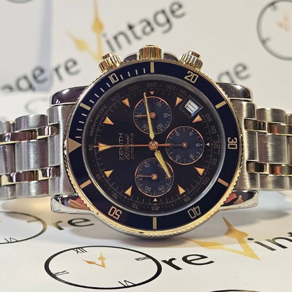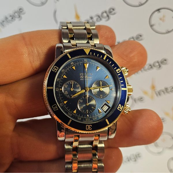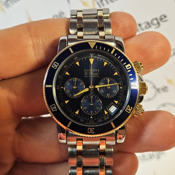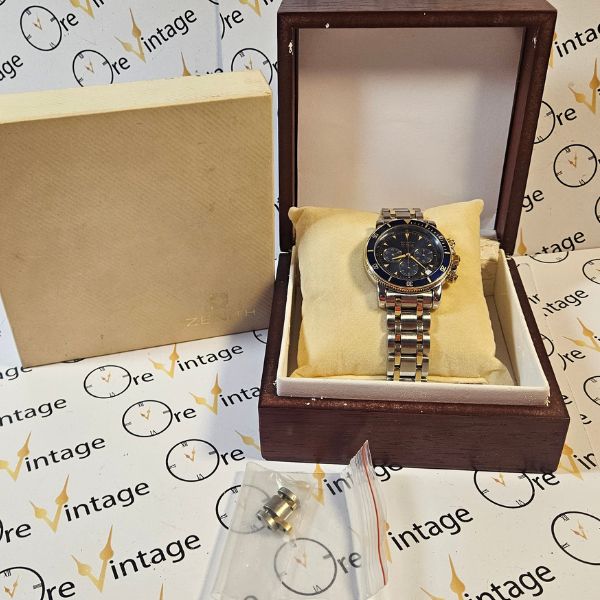 strepitoso cronografo di casa Zenith con cassa in acciaio e oro 14K di misure 40 mm , lug to lug 46 mm , spessore di 13 mm e la distanza tra le anse è di 20 mm . il vetro è zaffiro , la corona , i tasti e il fondello sono a vite . la ghiera blu è girevole bidirezionale . Il movimento è il famosissimo calibro 400 di casa Zenith a carica automatica con funzione di datario e cronografo . il quadrante blu è fantastico al sole . compreso di scatola in legno . bracciale orignale