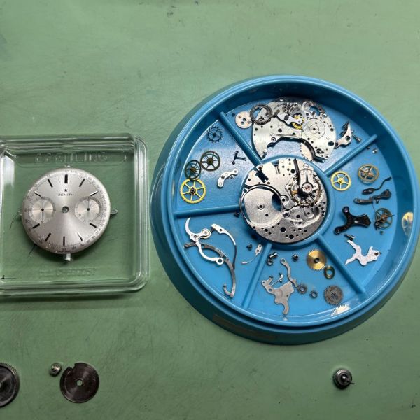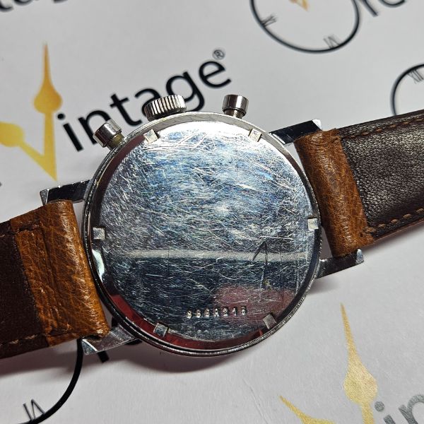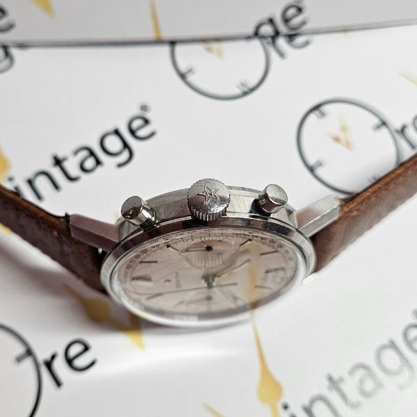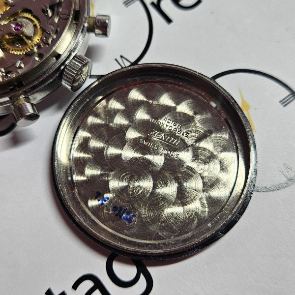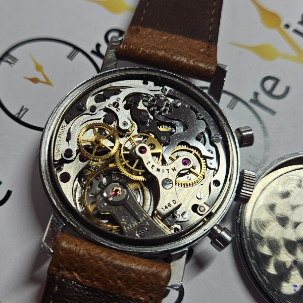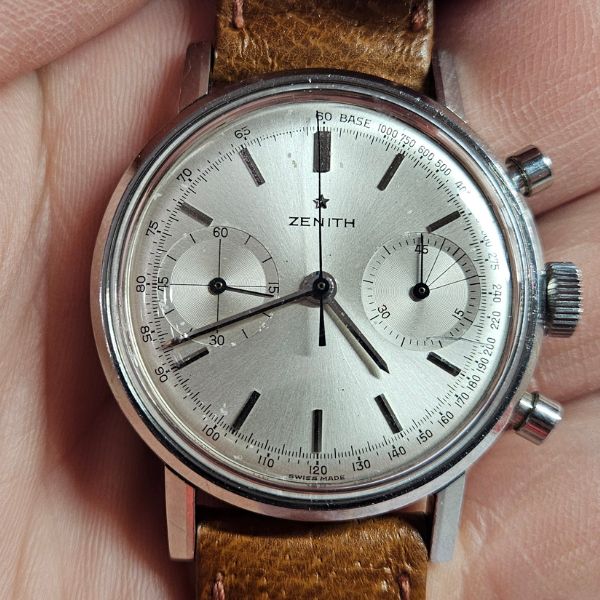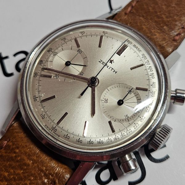 raro orologio di casa Zenith con la cassa in acciaio da 37 mm escluso corona , lug to lug di 44 mm , lo spessore è di 12 mm e la distanza tra le anse é di 19 mm . il vetro é plexy , la corona originale é a pressione e il fondello é a vite . il movimento che anima questo orologio é a carica manuale calibro zenith 146D . cinturino generico, fibbia originale . il quadrante porta i segni del tempo , graffio tra ore 3 e ore 4 .