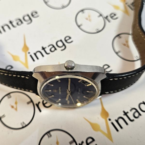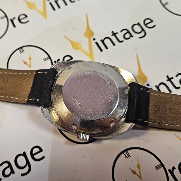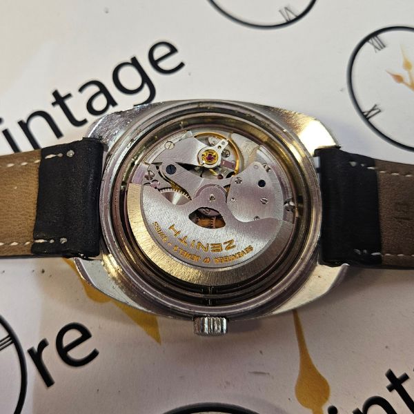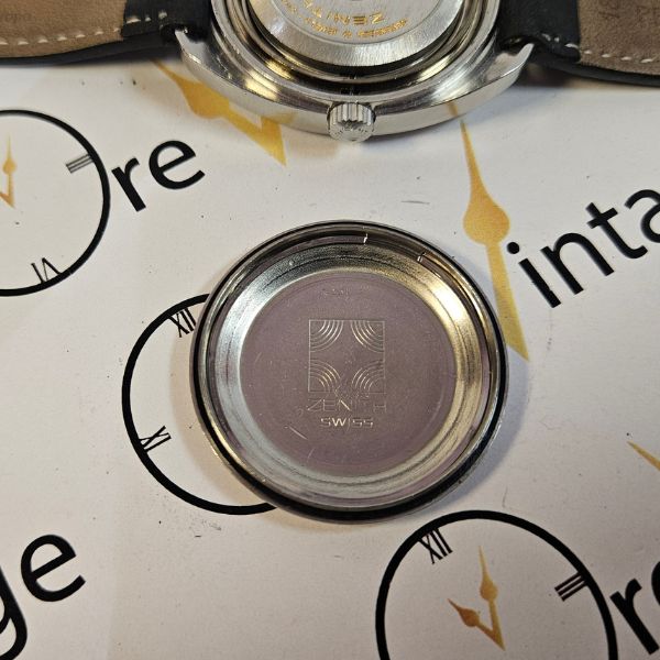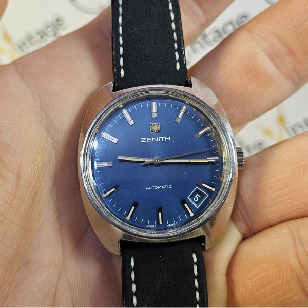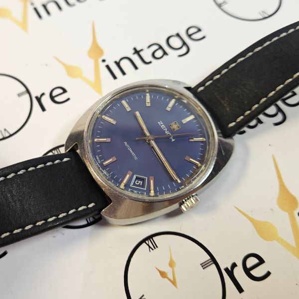 orologio di casa Zenith con cassa in acciaio di diametro 35 mm , lug to lug di 40 mm , lo spessore è di 11 mm e la distanza tra le anse è di 18 mm . il vetro è plexiglass , la corona originale è a pressione e il fondello è a vite, il quadrante di colore blu porta i segni del tempo , soprattutto da ore 1 a ore 3 come da foto . il movimento che anima questo orologio è a carica automatica ,calibro zenith 2572pc