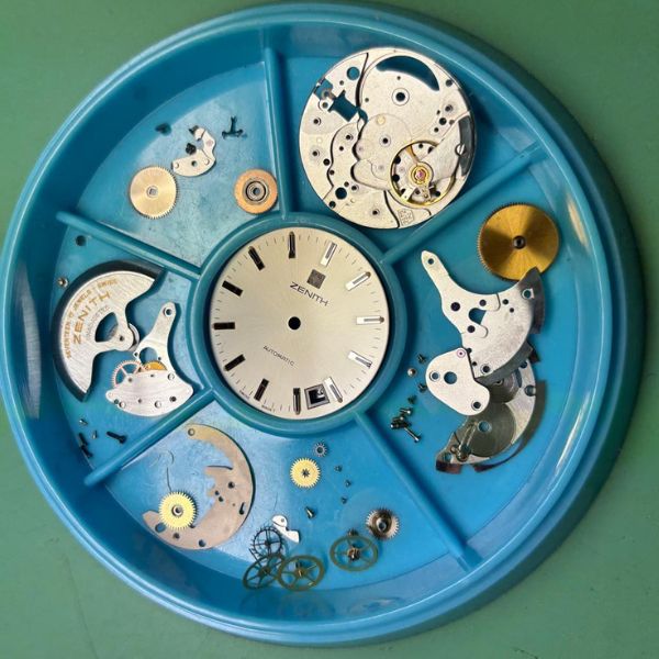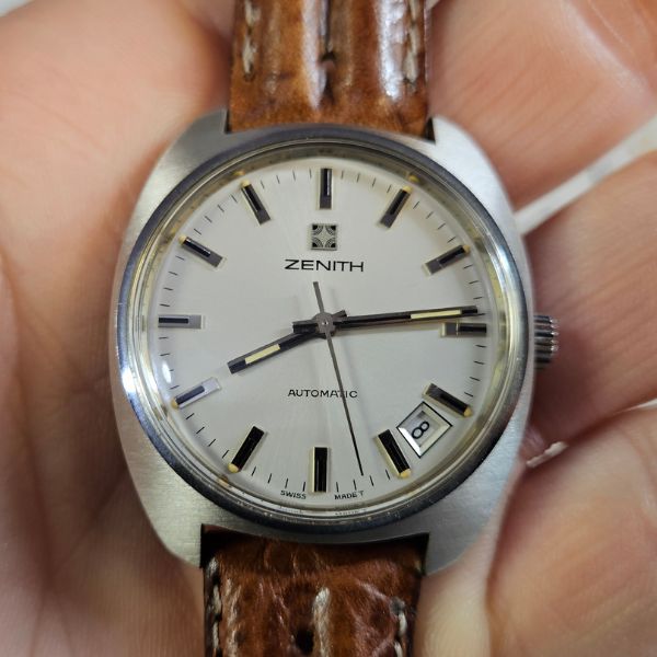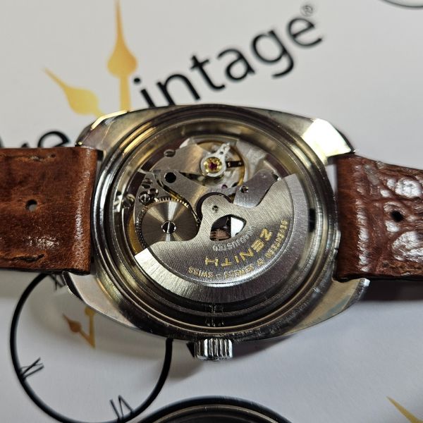bellissimo orologio di casa Zenith con la cassa in acciaio di diametro 35 mm escluso corona , lug t lug di 40 mm lo spessore è di 11 mm e la distanza tra le anse è di 18 mm. il vetro è plexiglass , la corona originale è a pressione e il fondello è a vite . il movimento che anima questo orologio è a carica automatica calibro zenith 2572PC . cinturino originale , fibbia generica